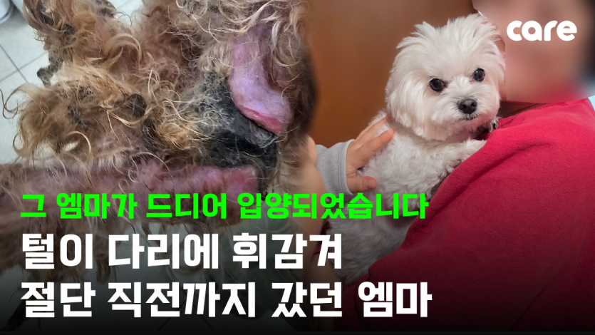 자신의 털이 다리에 휘감겨 절단 직전까지 갔던 엠마, 그 엠마가 드디어 입양되었습니다.