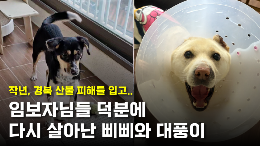 작년 경북 산불에서 가장 큰 화상을 입고 기적처럼 살아남은 삐삐와 대풍이.