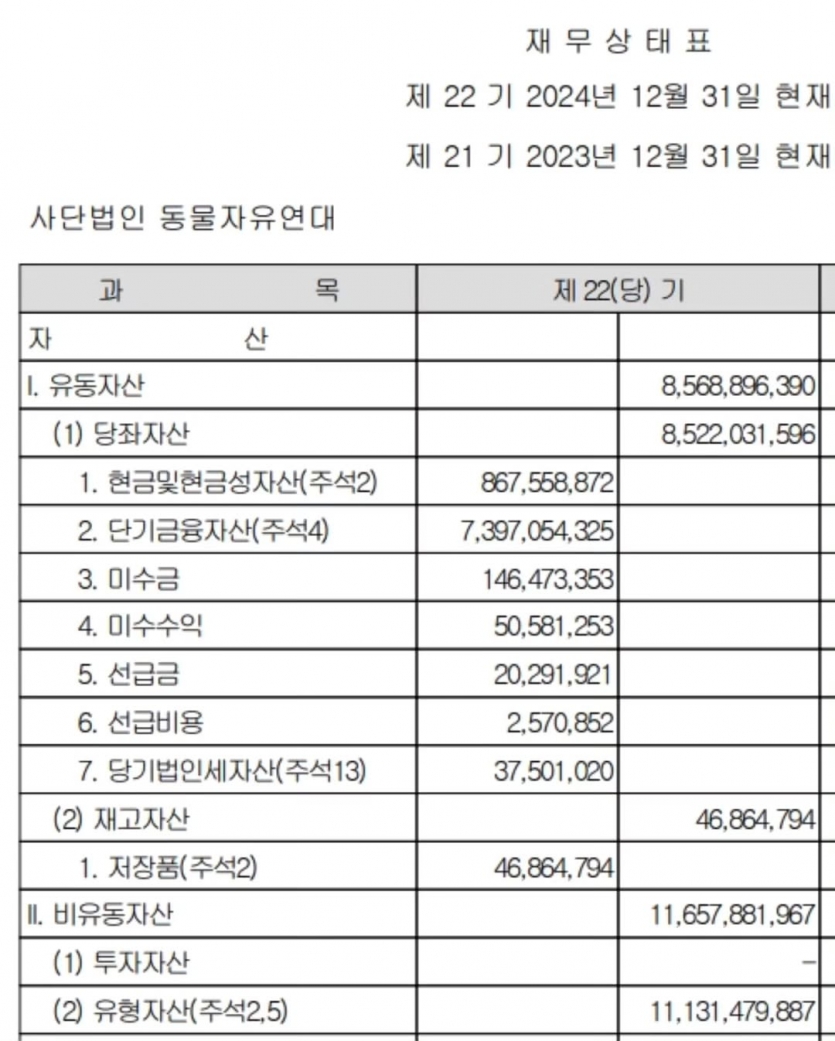 동물자유연대 (동자연)이 2024년 말 가지고 있는 현금등 금융자산은 82억원이 넘는다. 월 지출은 7억원 정도고 매월 4억원 정도의 흑자가 발생한다. 작년에 이어 올해에도 대규모 자산 취득을 하였지만 2025년 말에는 통장에 90억원 정도 있지 않을까 싶다. 여력이 어마무시하다.