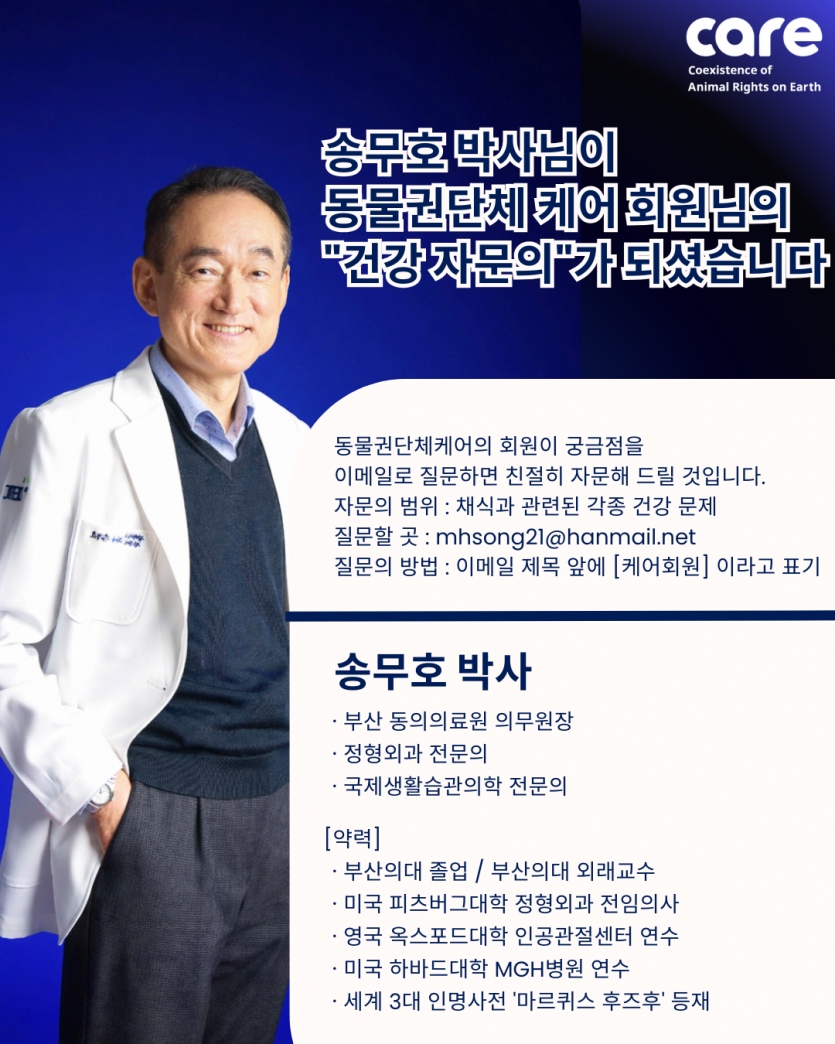 의학 전문인으로서 채식을 가장 적극적으로 옹호하고 있는 송무호님이 케어의 “건강자문의”가 되셨습니다.