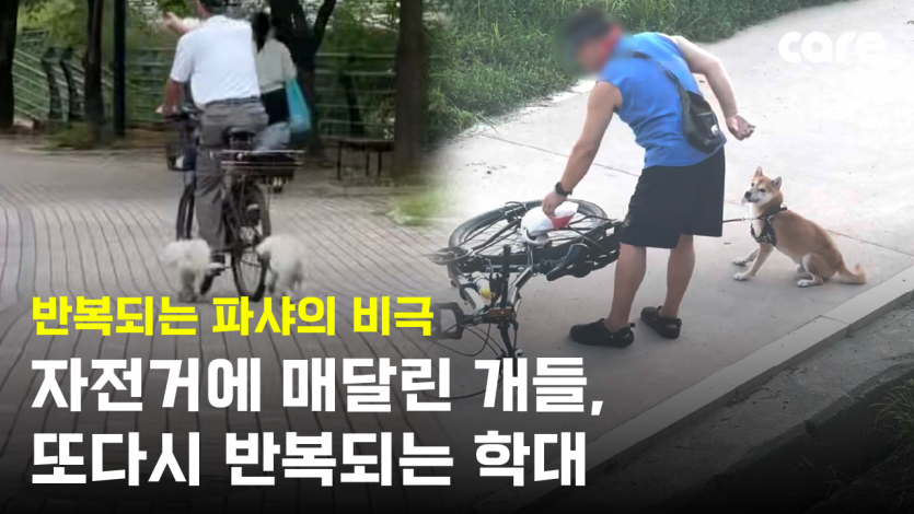 한 할아버지가 작은 말티즈 두아이를 자전거에 매단 채 이동하다가 자전거가 넘어지며 강아지들까지 쓰러졌습니다. 목줄은 꼬인 채였고 말티즈들은 힘겹게 끌려갔습니다.