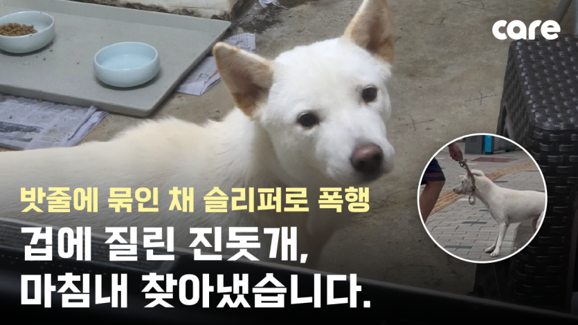 짧은 밧줄에 묶인 채 슬리퍼로 폭행당하는 장면이 반복적으로 목격된 진돗개.