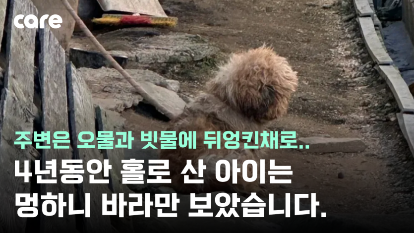 짧은 줄에 묶인 채, 개집은 있었지만 들어갈 수 없었고, 주변은 오물과 빗물에 뒤엉켜 물도 밥도 없이 있었습니다.