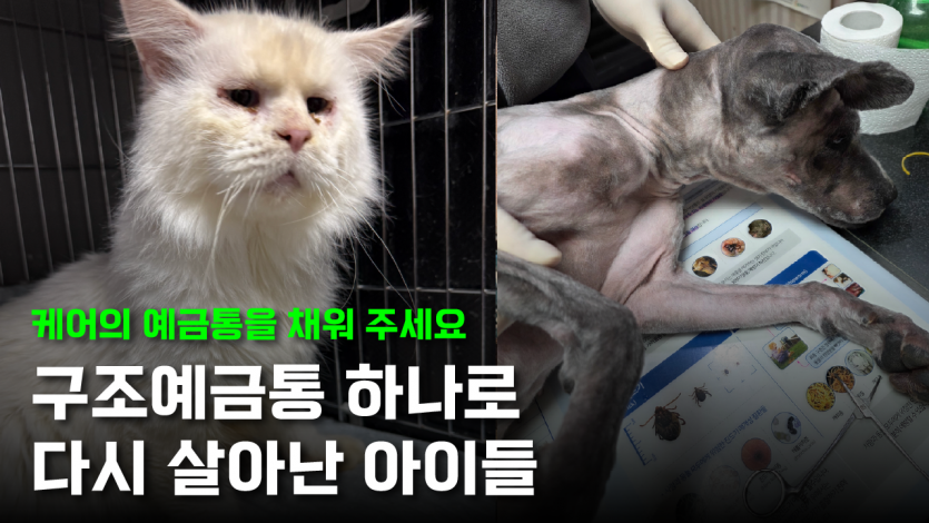 노을이는 지금도 수술 후 회복을 위해 힘을 내고 있고, 밥 말리는 위중한 상태로 집중 치료가 절실합니다.